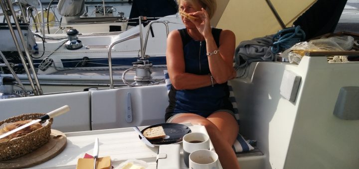Vi skulle have sovet længe i dag, men dem inde ved siden af skal sejle, så hele morgenen er der et rend hen over båden så vi opgiver – og står op.. Der kommer...