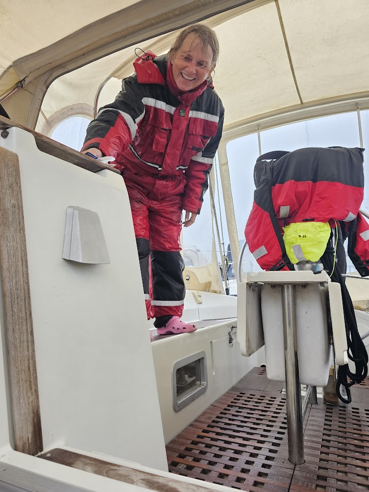 Henne ved sejlrenden, bliver regnen værrer, jeg går ned og tager min overlevelses dragt på, ikke fordi det er koldt, men for at hode regnen ude.