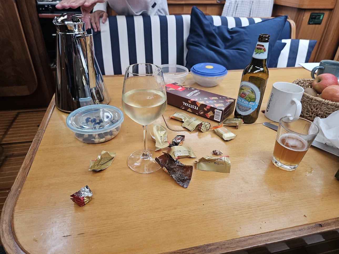 Nu sidder vi i kahytten og hygger, vinden er taget til igen, så jeg er lige ude at sætte et ekstra spring på.