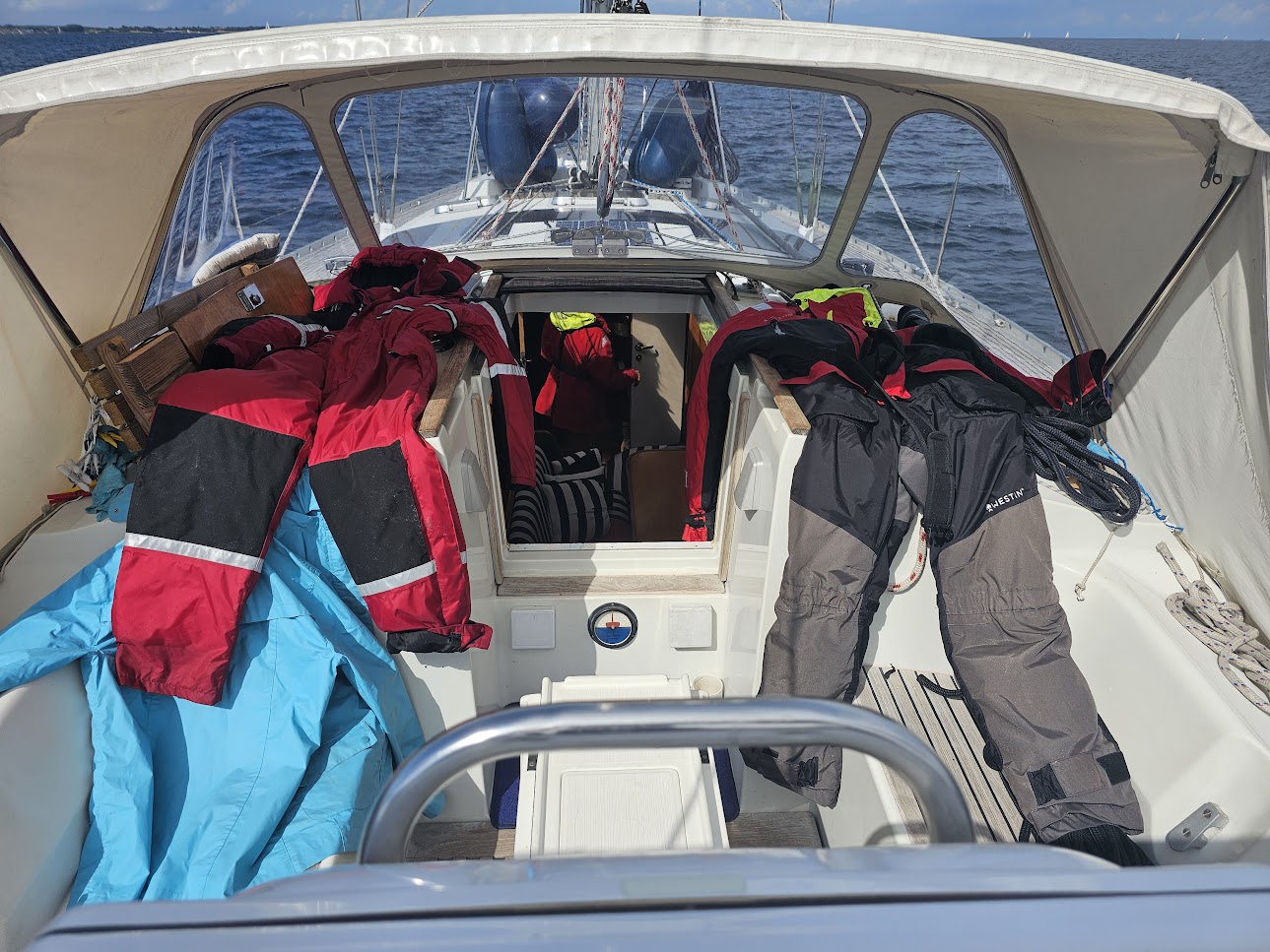 De har lovet 2 til 3 m/s. Heldigvis blev det til lidt mere, vi kunne sejle for sejl fra Rudkøbing til sydbøjen hvor man skal dreje styrbord ind i sejlrenden, derfra blev det for motor, vi havde vinden lig imod.