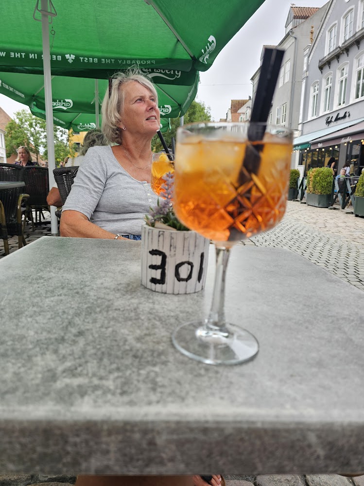 Vejret er fint selv om det er overskyet, vi går en tur op i byen, og igennem gågaden. Vi finder en cafè hvor vi får en aperol spritz.