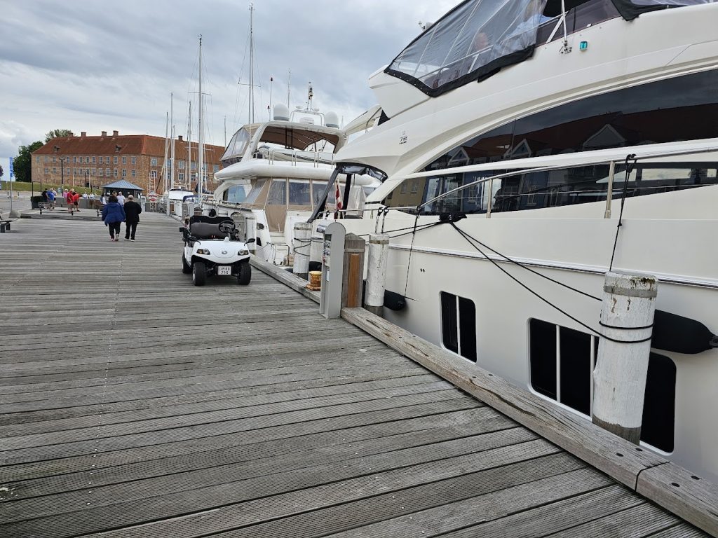 Det regner ikke endnu. Der er nogle meget sorte skyer. Vi pakker vores regnslag sammen og begiver os en tur ned til lystbådehavnen. Den er stor, vi fik ikke lige øje på nogle pladser der er brede nok til vores båd. Men det må der være.