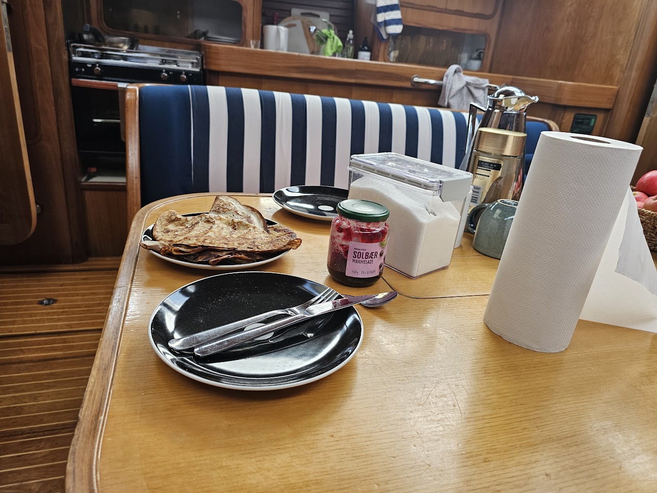 Så er det tid til en kold øl og frokost. Det er altid højdepunktet på vores sejlture. Og så en tiltrængt lur i cockpittet i det gode vejr. – Lige indtil vi bliver vækket af regnvejret. Naboen siger, vi må da ikke håbe at det er regnvejret fra Esbjerg der kommer. Der har det regnet voldsomt, og grøn koncert er blevet aflyst, de går i vand til knæene. Det er da heldigt vi sidder i en sejlbåd, hvis der kommer så meget regn. Jeg tænker vi følger med op efterhånden som vandet stiger.