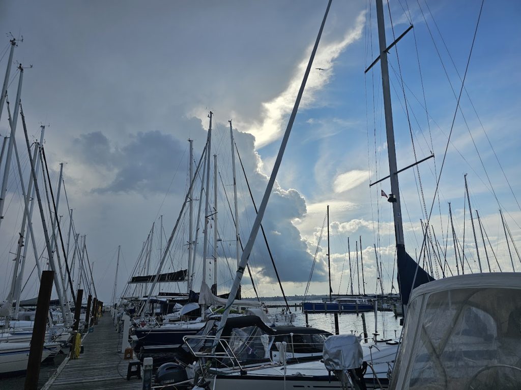 Vi spørger havnefogeden, han har en transportabel tømmeting. Men han siger også at vi bare kan sejle til Gråsten, der kan man tømme, og der er kun tre timers sejlads. Men hvad nu med tordenvejret? Det ser meget fredeligt ud.
