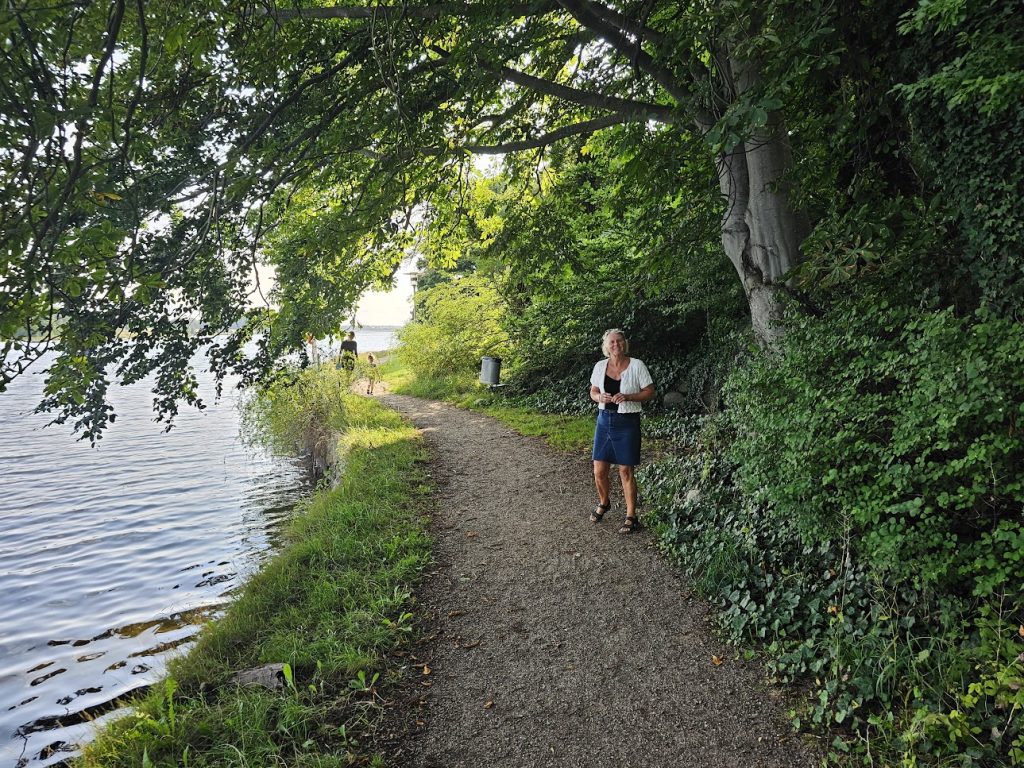 Vi går op på havnekontoret kl 6. Derefter går vi en tur overfor at se Augustenborg, det er et stort slot. Der bor ikke nogen, det er statsejet og bruges til kontorer. Der er en kæmpe park bag ved, med en masse store træer.