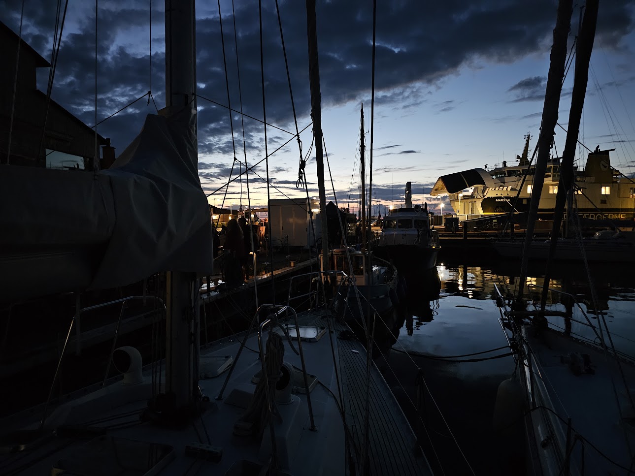Vi finder en plads lige foran det gamle værft. Der er noget musik. Det viser sig at der er jazz festival fra d. 30 juli til d. 2 august. Så vi har fået første parket til Tabloid der spiller i aften.