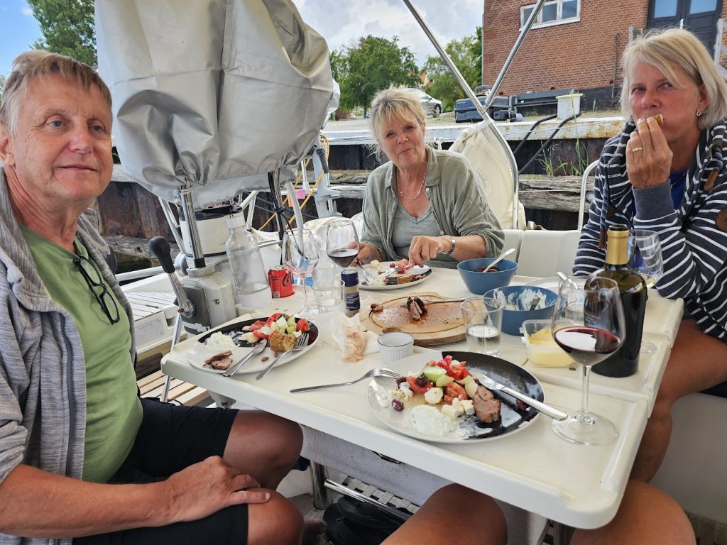 Berit og Jens kommer ved et tiden, der er flere ledige langskibspladser. Vi byder på et glas hvidvin i cockpittet. Der kommer en katamaran og lægger sig uden på os. Vi vil jo egentlig gerne videre i morgen tidlig. De accepterer at stå tidligt. op. Netop som de har fortøjret, bliver der en ny langskibs plads ledig Jens og jeg hjælper dem med at komme på plads, vi får en længere sludder med ham og han spørger om vi vil ind og se katamaranen, det vil vi gerne. Det er en lille katamaran, man kan ikke stå oprejst i deres “stue”, men i pontonnerne går det bedre, der har de køkken i den ene side og soveværelse i den anden.